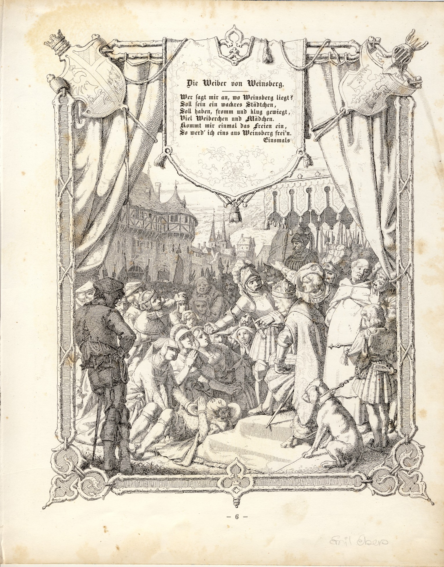 Die Weiber von Weinsberg von Emil Ebers (Radierung).In: Deutsche Dichtungen mit Randzeichnungen deutscher Künstler, Bd. 2 (Düsseldorf: Julius Buddeus 1850). (Sammlung Klaus