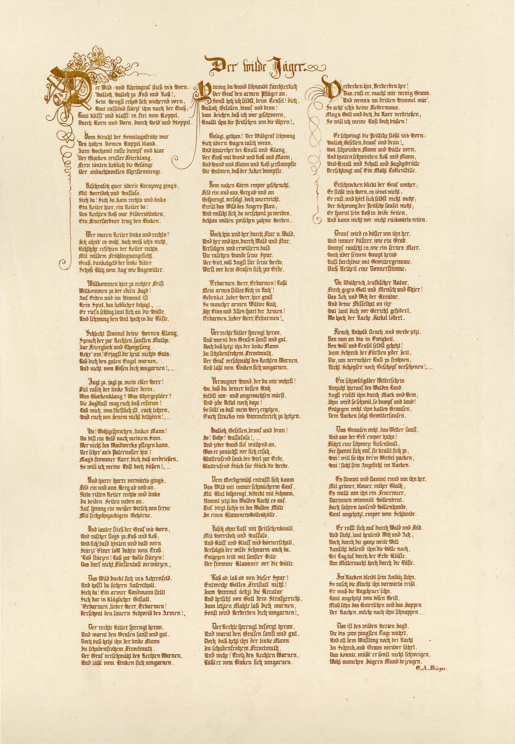 von Eugen Napoleon Neureuther. Ganze Textseite von Bürgers Gedicht 'Der wilde Jäger'. Lithographie in Gold gedruckt. 1838. The British Museum, Collection online.